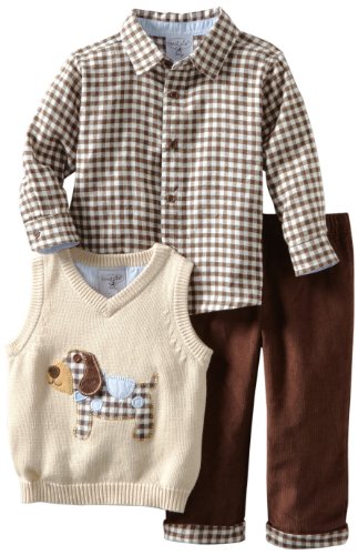 3 piece set includes cardigan sweater with puppies applications, plaid shirt and brown khaki corduroy pants with elastic waist